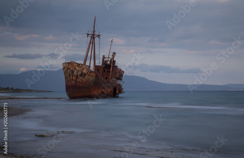 The famous rusty shipwreck near Gytheio at sunset