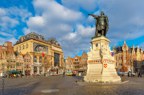 The famous square Friday Market with Jacob van Artevelde statue in the sunny morning, Ghent, Belgium