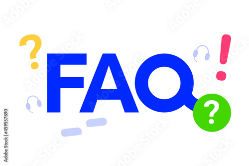 The FAQ word with graphic elements of the question, exclamation mark, chat, headphones