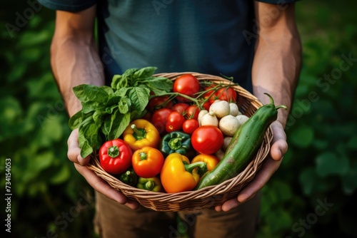 The farmer holds a basket with Organic Vegetables , A delighted young farmer holds a basket of fresh vegetables in a natural setting, symbolizing organic, eco-friendly, Ai generated