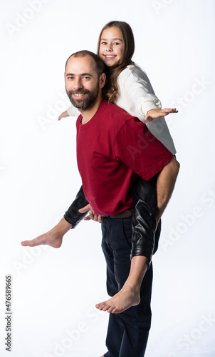 the father put his daughter on his back, the girl spread her arms like wings. isolated background