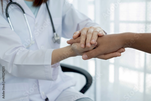 The female doctor uses a friendly hand to hold the patient's hand to give confidence and show care about health care. Medical concepts and good health