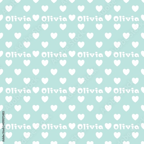 The female name is Olivia. A postcard for Olivia. Seamless repeating pattern with hearts. Congratulations to Olivia. Background for scrapbooking, albums, advertising, websites, bloggers.