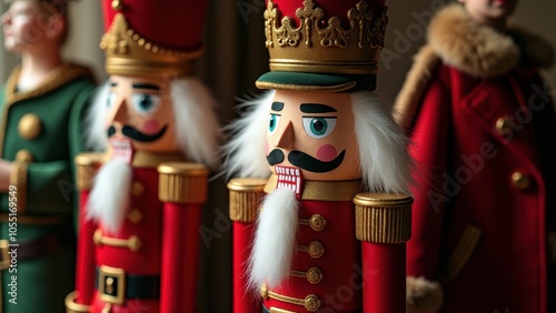 The festive scene features a nutcracker alongside red Santa coats. A decorated Christmas tree glows softly in the background, enhancing holiday warmth.