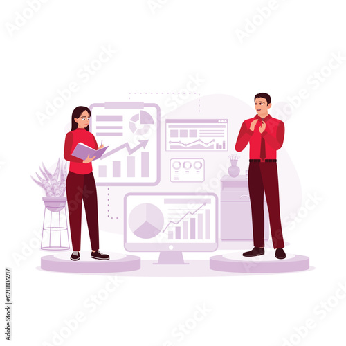 The finance manager and secretary audit, check and make financial reports. Trend Modern vector flat illustration