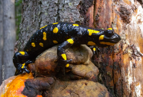 The fire salamander (Salamandra salamandra) in the forest near the city of Yaremche, Ivano-Frankivsk region, Ukraine