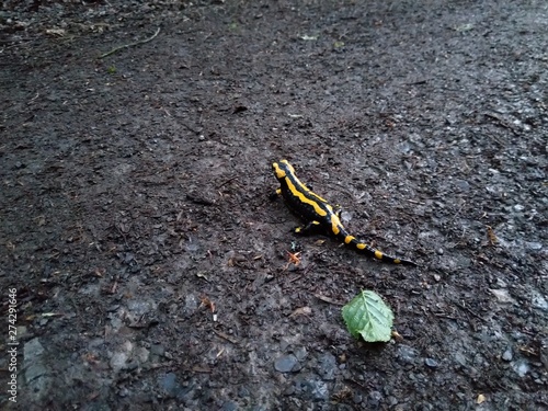 The fire salamander (Salamandra salamandra) is possibly the best-known salamander species in Europe. Macro portrait on a forest street in Germany