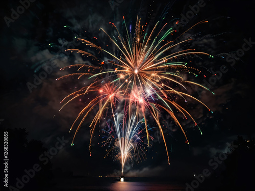 The fireworks burst into vibrant colors, lighting up the night sky.