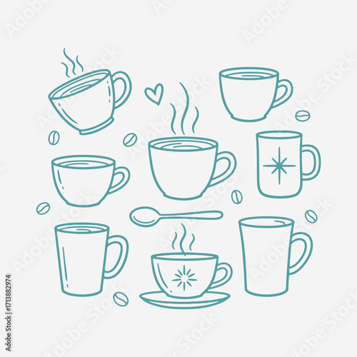The flat design concept for a collection of coffee cups and mugs silhouettes focuses on simplicity, elegance, and ease of recognition.