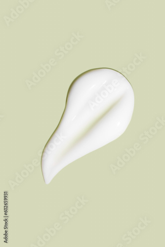 The flowing cream on a green background. Smudged flowing smear of cosmetic cream.