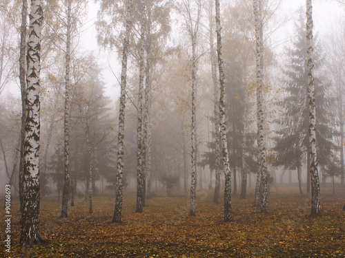 the fog in birch grove in cold morning in November.