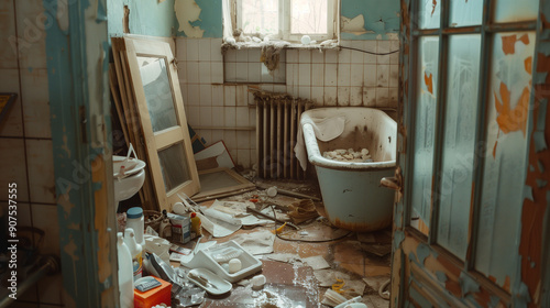 The folding screen has collapsed, and around it in the bathroom there are a lot of things lying around, creating a mess. The room gives the impression of disorderly chaos.
