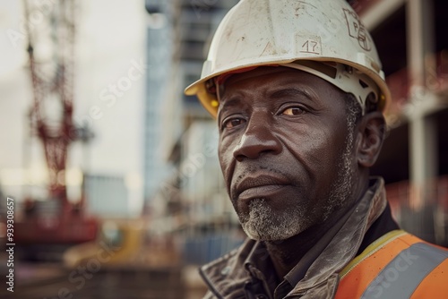 The foreman, clad in a hard hat and high-visibility vest, surveys the construction area with a focused expression as the day winds down, ensuring safety and progress