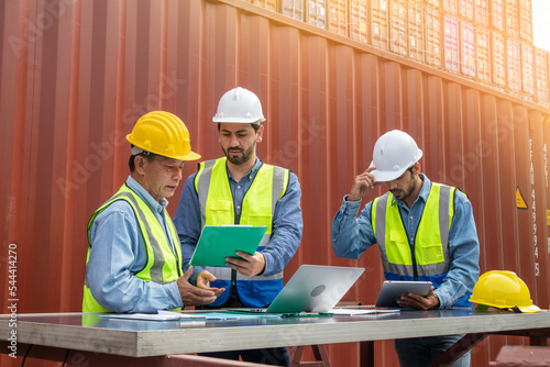 The foreman team has a meeting in the cargo container area. Container import export and logistic concept