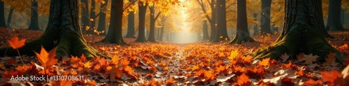 The forest floor is blanketed with a layer of fallen leaves, forest landscape, autumn forest floor leaf carpet