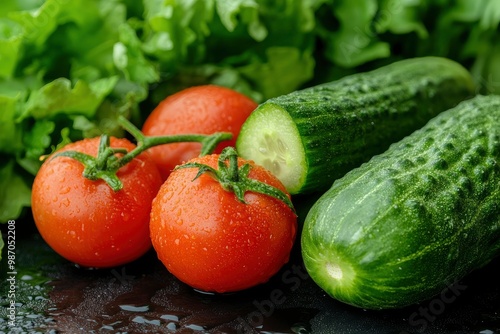 the freshest cucumbers and tomatoes for salad on a green background , ai