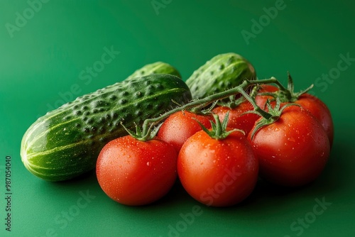 the freshest cucumbers and tomatoes for salad on a green background , ai