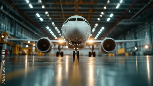 The front view of a modern airplane with its landing gears in focus, situated in a hangar illuminated by artificial lights, highlighting its technological marvel.