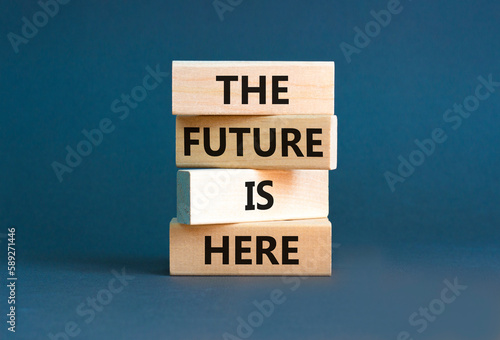 The future is here symbol. Concept words The future is here on wooden block. Beautiful grey table grey background. Motivational business the future is here concept. Copy space.