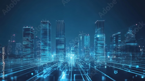 The futuristic architectural concept of a smart city with modern buildings and sustainable infrastructure represents an innovation in urban planning.