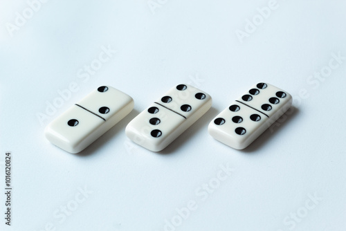 The game of dominoes is a table game involving rectangular pieces with dots that represent numbers. The objective is to match tiles with matching numbers. Photo with white background.