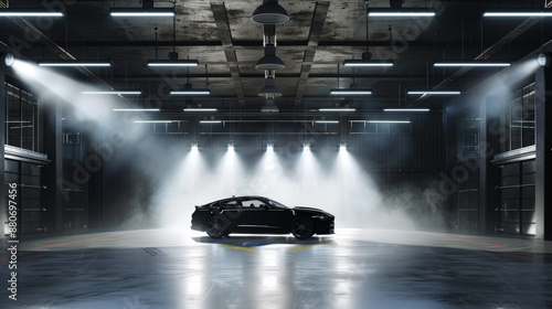 The garage interior is depicted with dim lighting and a haze of smoke, creating a dramatic and industrial ambiance.