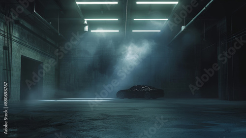 The garage interior is depicted with dim lighting and a haze of smoke, creating a dramatic and industrial ambiance.