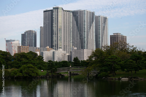 The Gardens of Hamarikyu are a public park in Chūō, Tokyo, Japan. Located at the mouth of the Sumida River they are surrounded by modern buildings.