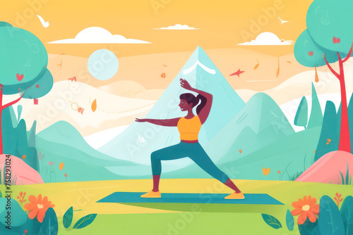 The girl is doing yoga against the background of nature. Illustration for Yoga Day. Copy Space.