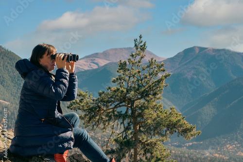 the girl looks through binoculars at the mountains. Arkhyz, Karachay-Cherkessia, Russia.