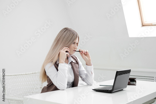 The girl office worker is annoyed. Shouts on the phone and outraged.