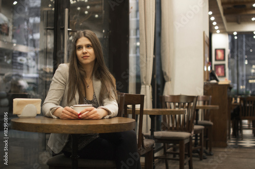 the girl sits in a cafe