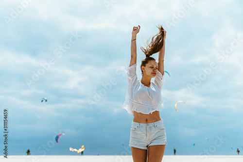 the girl triumphantly threw up her hands in the sky, her tail from her hair also took off from the wind up, behind the ocean, the sky and kites fly