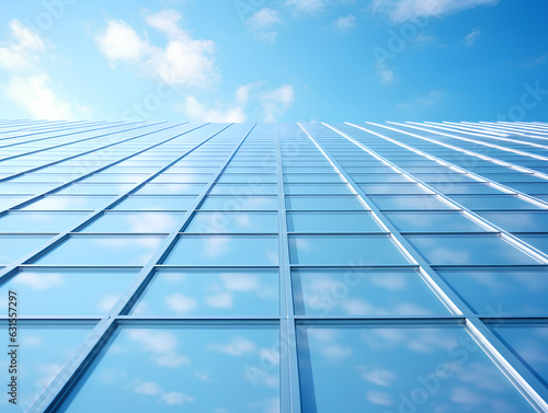 the glass wall of the building against the background of the blue sky with white clouds, the sky reflects from the office building, the photo from below is the top of the building