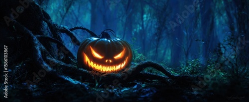 The glowing jack-o'-lantern illuminates a mysterious forest at night.