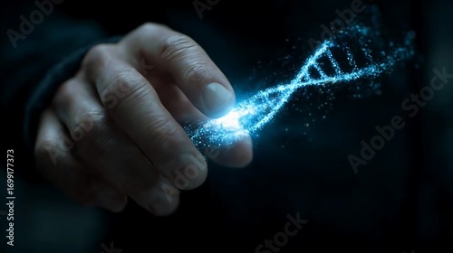 The glowing strand: A hand gently interacts with a luminous dna molecule in a darkened setting
