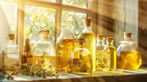 The golden hour casts a radiant glow over bottles of herbal infusions, highlighting the delicate botanicals within each glass vessel.
