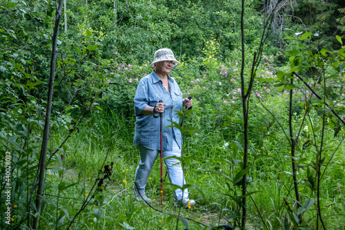 The grandmother is engaged in Scandinavian walking. An elderly woman goes in for sports.