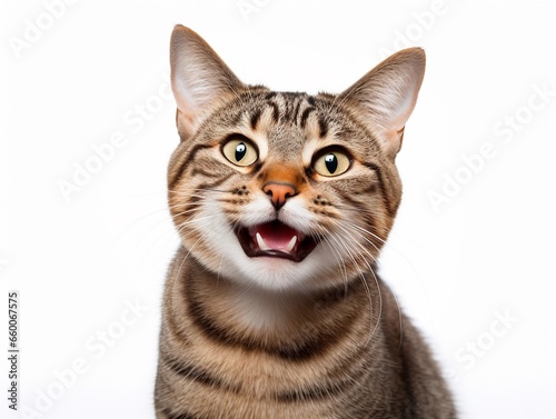 The gray tabby cat looks at the camera, mewing and having slightly opened a mouth