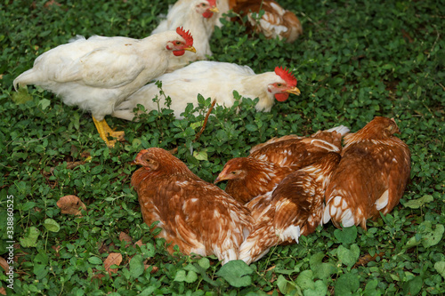 The Group Rhode Island hen is rest on green grass in garden at thailand
