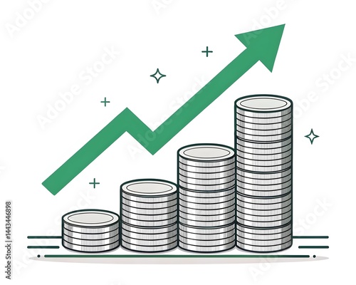 The growing financial success illustrated by a stacked coin with rising graph, symbolising an increase in income and achievement.