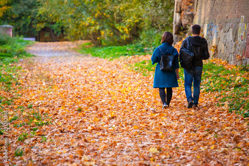 the guy and the girl are walking in a beautiful autumn park