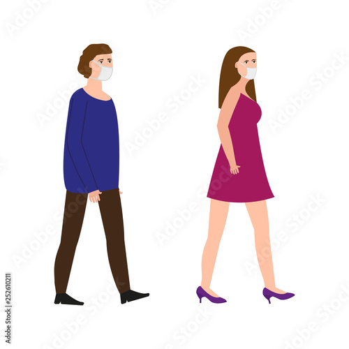 The guy and the girl go in gauze masks, dust in the air, polluted environment, infectious disease, epidemic vector illustration