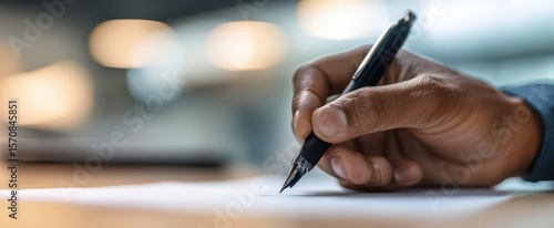 The hand elegantly writing with a pen on a blank sheet of paper.