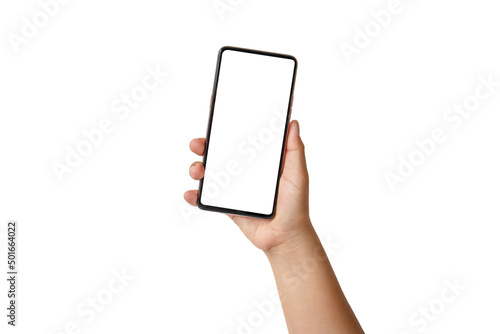 The hand is holding the white screen, the mobile phone is isolated on a white background with the clipping path.