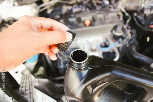 The hand of a car mechanic opens the engine oil cap to inspect before changing the car engine oil , Car maintenance concept