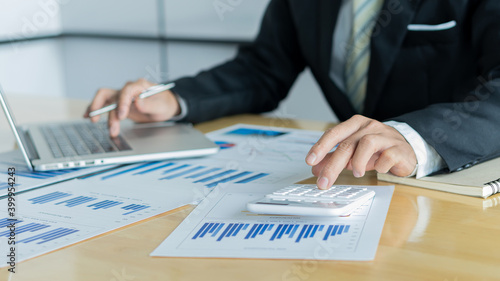 The hand that presses the calculator and holds the pen of a businessman working with a laptop with a graph is placed on a table with a blurred background.