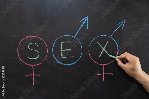 The hand writes the word SEX written in the gender symbols of men and women and the symbol of gender equality. Drawing on a chalk Board