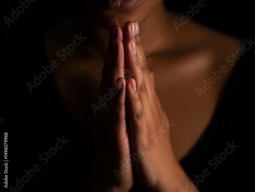 The hands folded in prayer, symbolizing faith and serenity, are illuminated against a dark backdrop. This intimate portrait captures a moment of spiritual reflection.