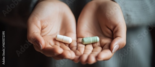 The hands holding white and green capsules for health and wellness choices